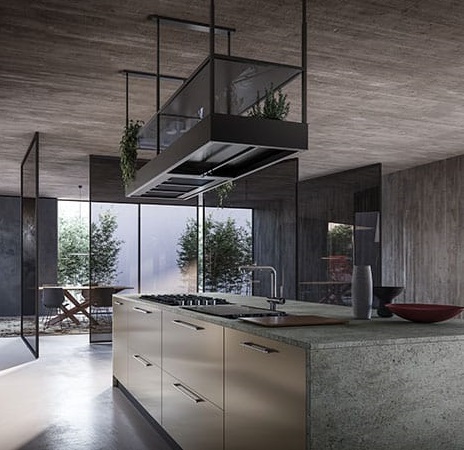 Сложная координация цветов и текстур лежит в основе этого проекта. Утонченный рисунок поверхности лакированных металлических шкафов Carbonio сочетается с элегантным деревянным шпоном Olmo, объединенным фигурными столешницами и двухцветными керамическими элементами Inalco различной толщины. Профили Grip с отделкой Titanio.