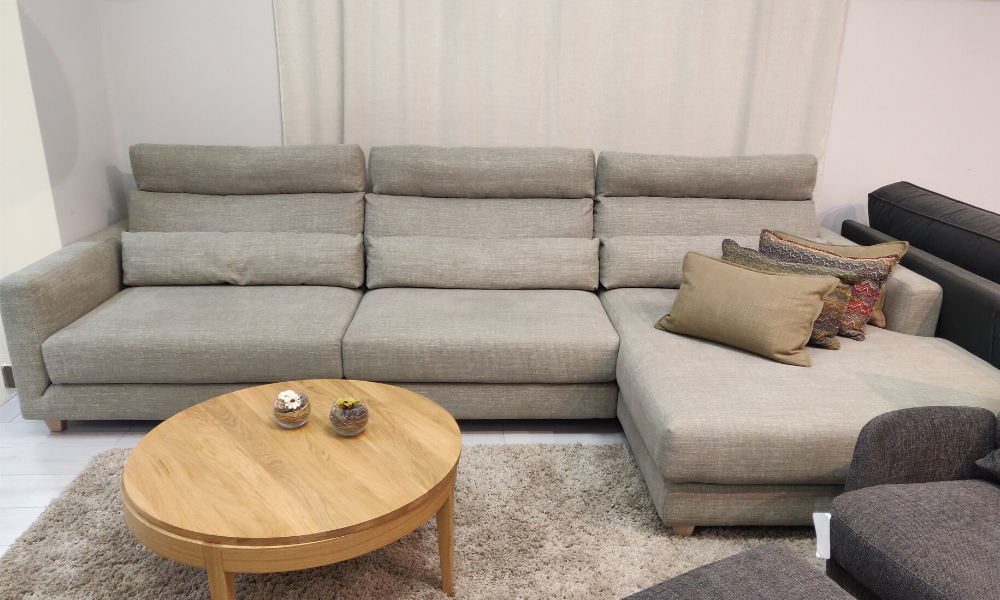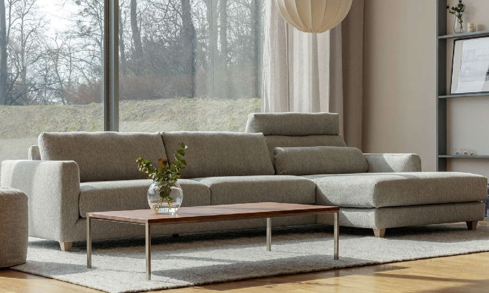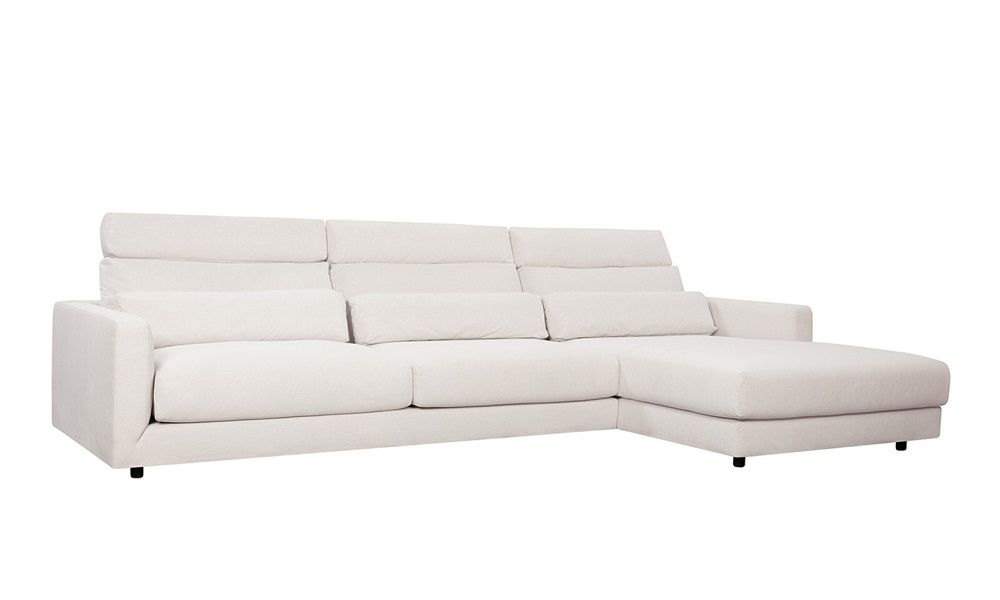 Диван Sits Nora. Линейка включает много конфигураций угловых и прямых диванов, пуфы и кресла, а также разные варианты обивки, отделки и наполнения. Размеры: 326 х 180 х 108 (80/44) см.