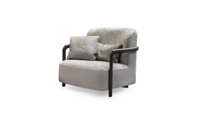 Кресло Formitalia Mimi в современном стиле из Италии. Размеры: 96 x 94 x h90 см. Материалы: ножки и подлокотники из ясеня в чёрной отделке, сидение и спинка изнутри обиты тканью серого цвета, а снаружи – кожей в отделке Royal grey.