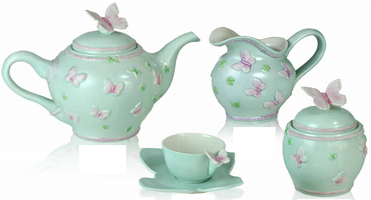 Сервиз выполнен из фарфора бирюзового цвета и украшен бабочками, цветочками и бантиками.