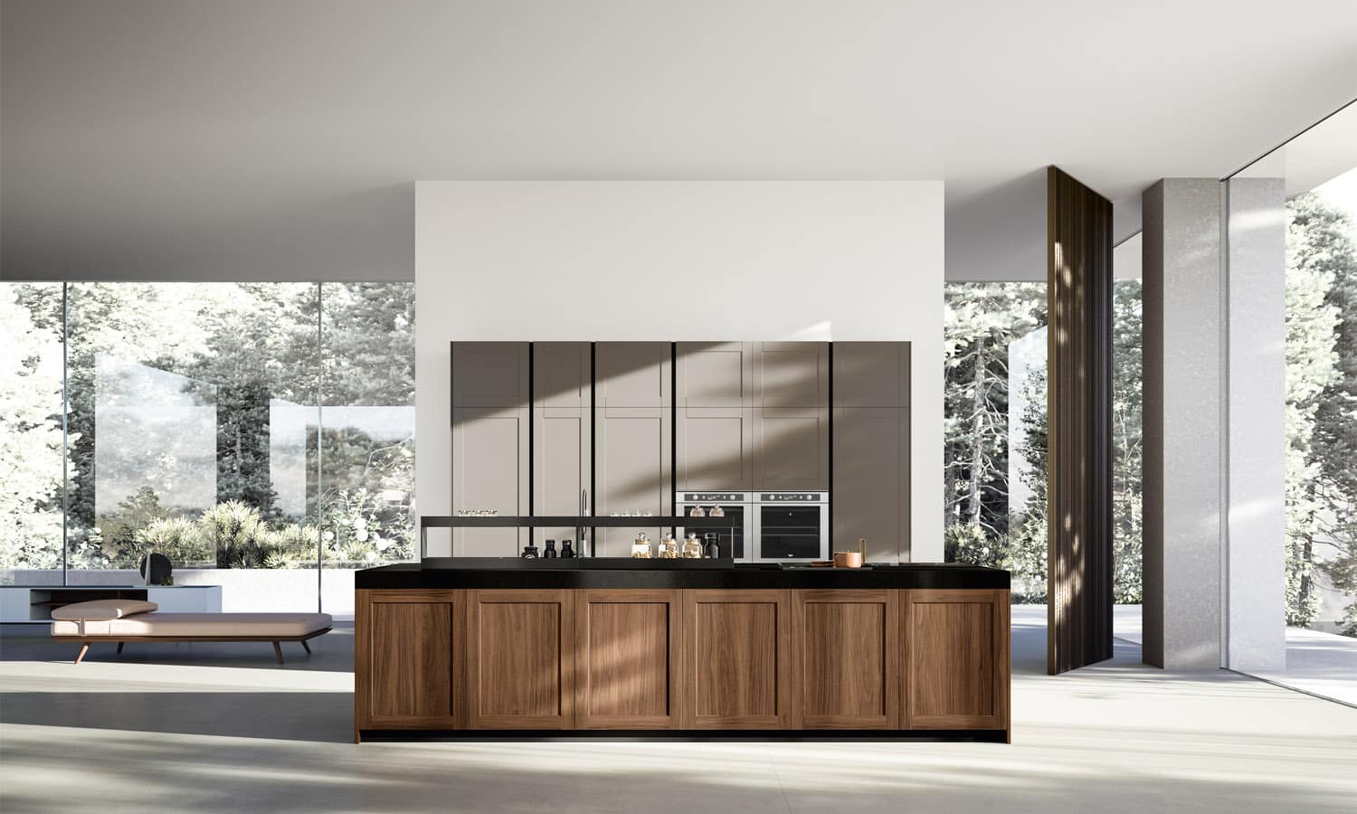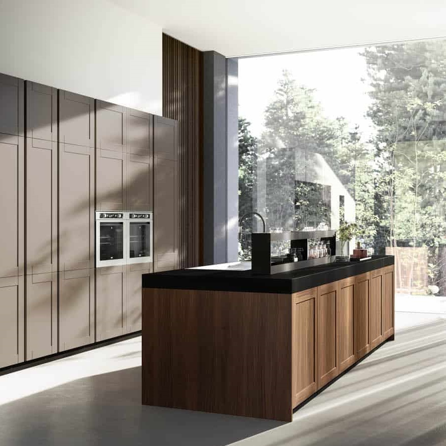 Кухня Armony Cucine Ligna пробуждает воспоминания и идеи, представленные дверью из массивной древесины Noce на острове и МДФ Metro laccato opaco на высоких панелях. Точный, существенный дизайн подчеркивается системой открывания дверцы Push-Pull и особенно толстой столешницей Silestone.