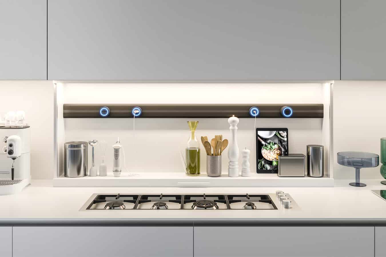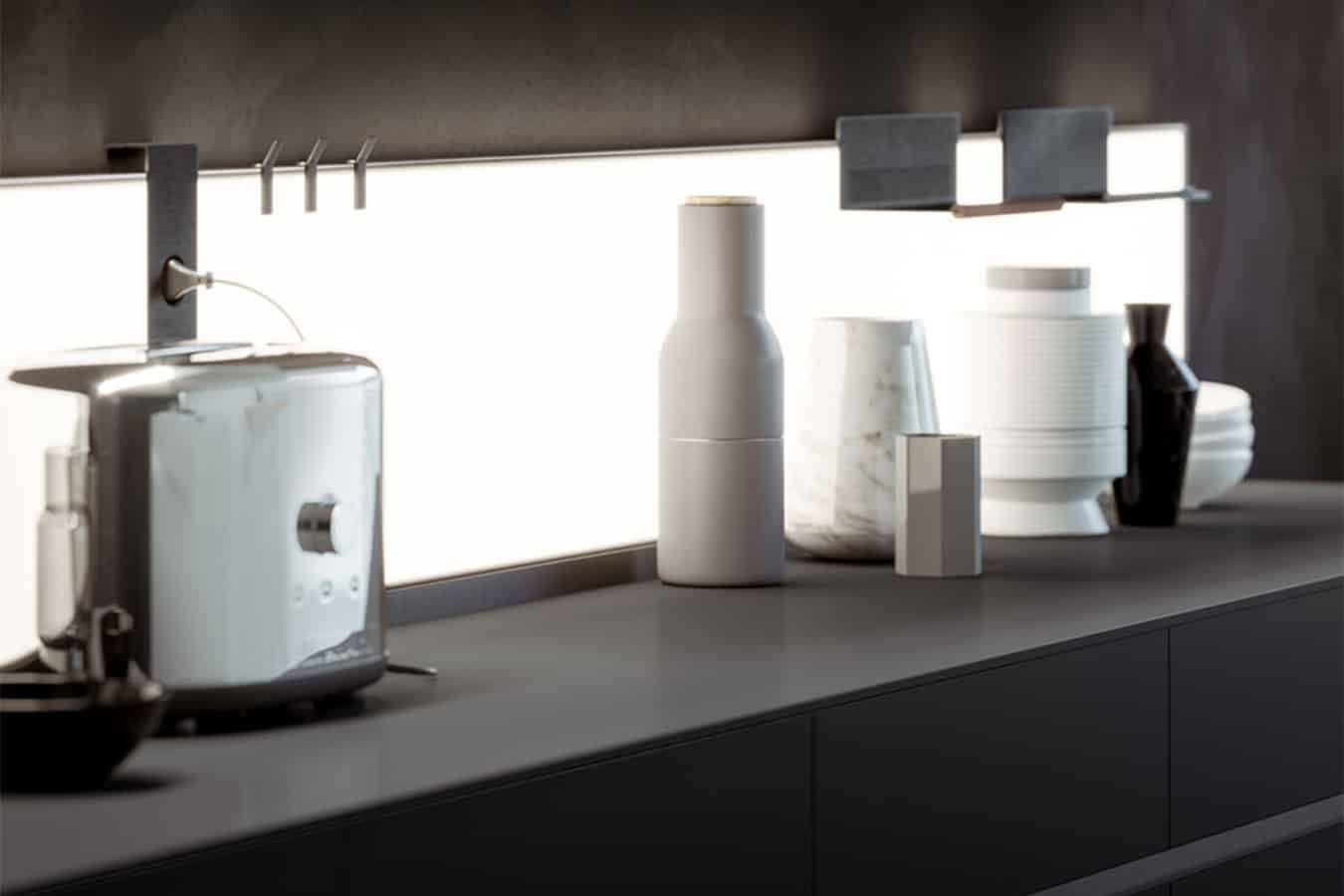Armony представляет светящуюся K-панель. На задней поверхности свет постоянно распространяется по всей площади. Отличный живописный результат, задуманный для освещения всей рабочей поверхности. В верхней части панели есть вторая светодиодная лента, которая освещает стену. K Panel предлагает широкий ассортимент модных аксессуаров из алюминия и дымчатого стекла.