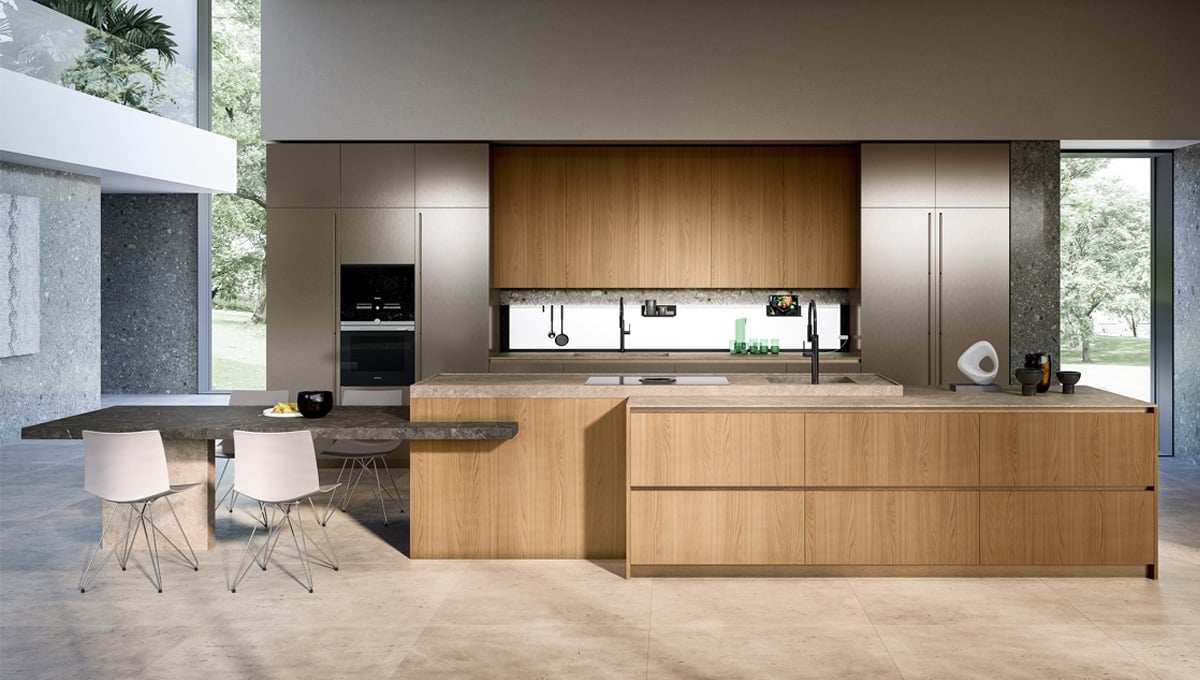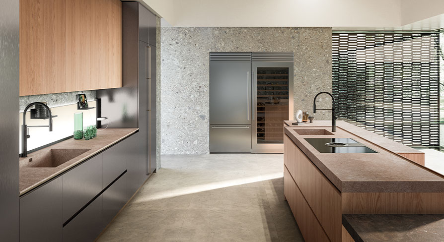 Сложная координация цветов и текстур лежит в основе этого проекта. Утонченный рисунок поверхности лакированных металлических шкафов Carbonio сочетается с элегантным деревянным шпоном Olmo, объединенным фигурными столешницами и двухцветными керамическими элементами Inalco различной толщины. Профили Grip с отделкой Titanio.