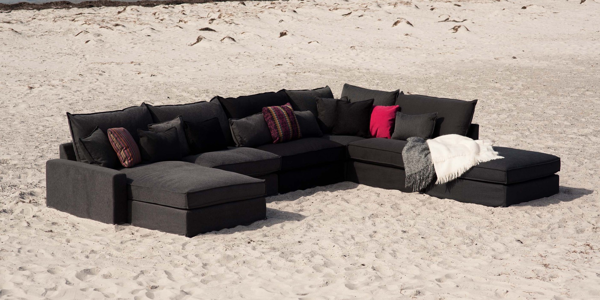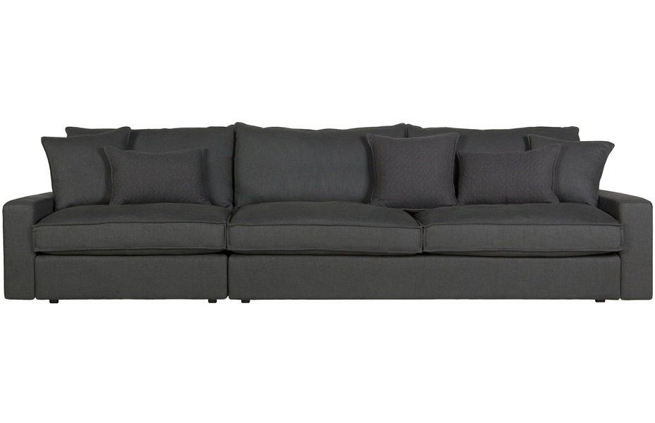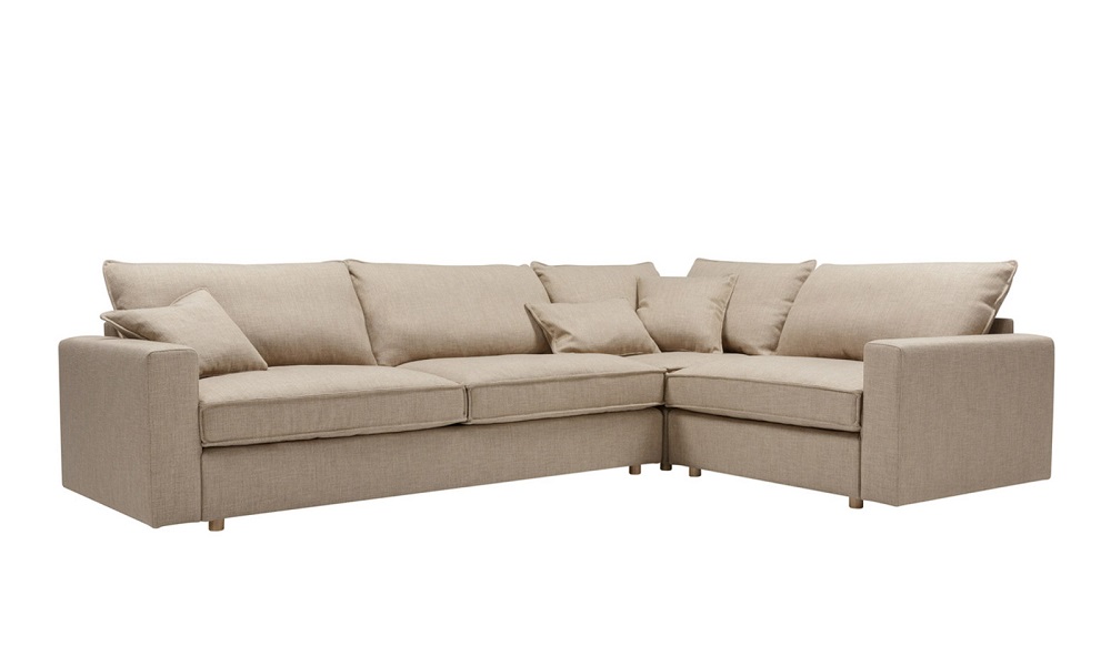 Диван Sits Oscar с пуховым наполнением подушек спинки и сиденья. Линейка включает много конфигураций угловых и прямых диванов, пуфы и кресла, а также разные варианты обивки и отделки. Возможны варианты со съёмным чехлом.
