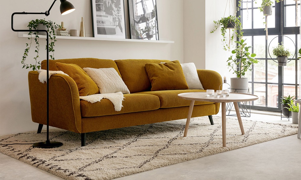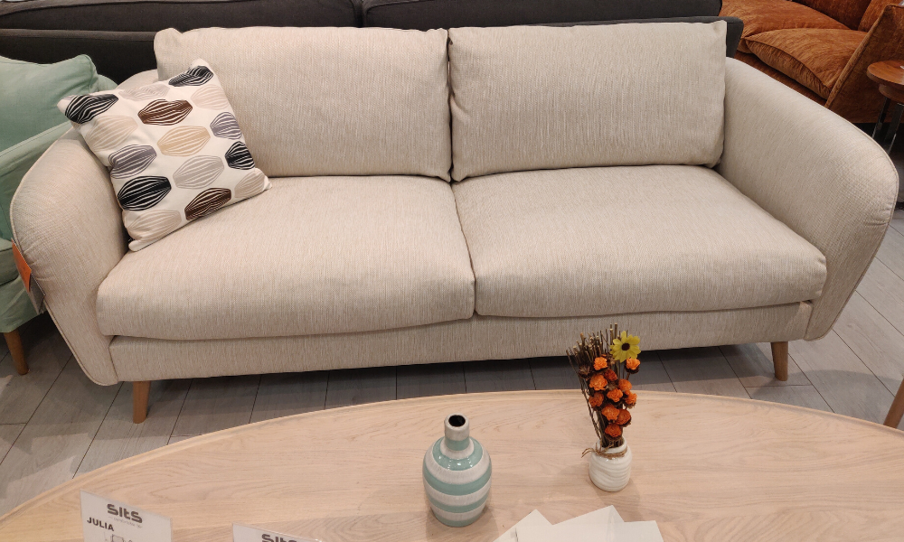 Диван Sits Polly с пуховым наполнением подушек спинки и сиденья. Линейка включает много конфигураций угловых и прямых диванов, пуфы и кресла, а также разные варианты обивки, отделки и наполнения. Возможны варианты со съёмным чехлом.