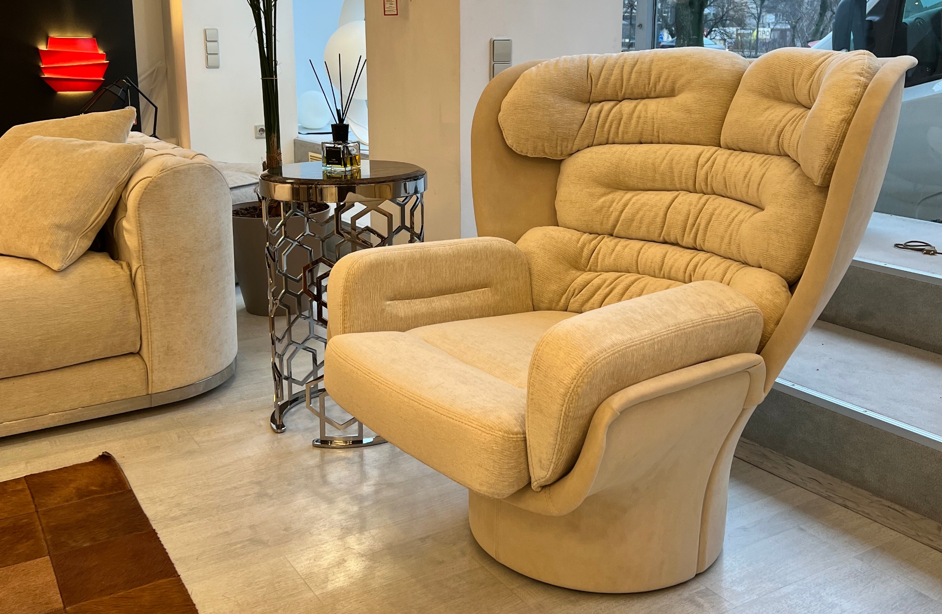 Кресло Elda изготавливается по оригинальной технологии, полностью ручным методом, вращается на 360°. Наполнение из эластичного пенополиуретана, анатомическая форма. Обивка тканевая.