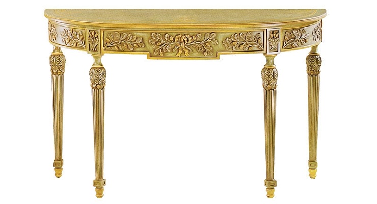 Консоль Chelini 551 в классическом стиле. Полукруглая столешница с фигурными ребристыми ножками декорированы золотыми резными ветвями. Размеры: 98 х 138 см.