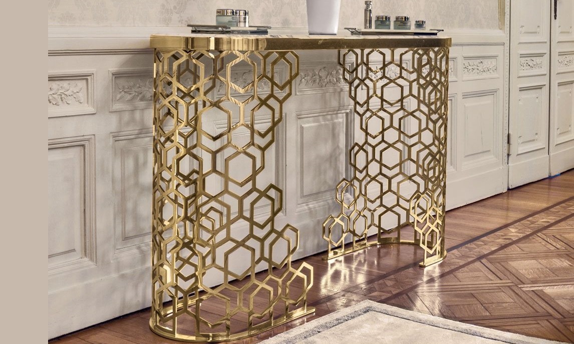 Консоль Longhi Manfred из Италии с основанием, выполненным из шлифованного лазером металла и изогнутой отделкой «Sequence». Отделки: черное розовое золото, яркое светлое золото, матовое золото шампанского, яркий хром, яркий черный хром, матовая атласная бронза, ярко-розовое золото, матовое розовое золото. Для столешницы используется мрамор в различных вариантах отделки.