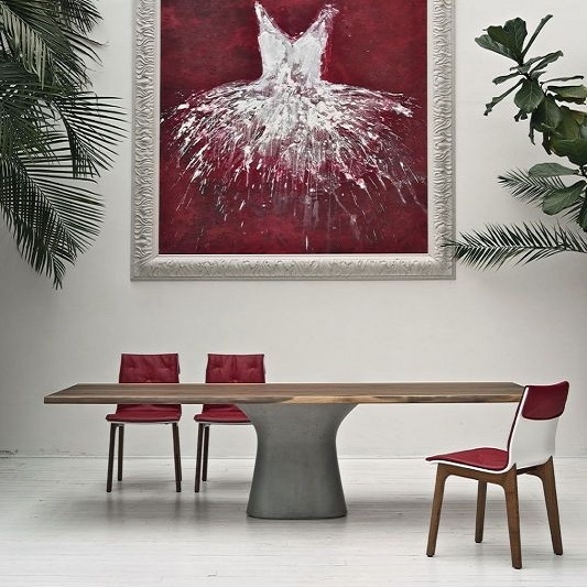 Фиксированый стол Bontempi Podium 52.14 с бетонным основанием. Столешница из шпона с кромкой из массива дерева, глянцевого стекла с бархатно-матовым покрытием, устойчивым к царапинам, или супермрамора.