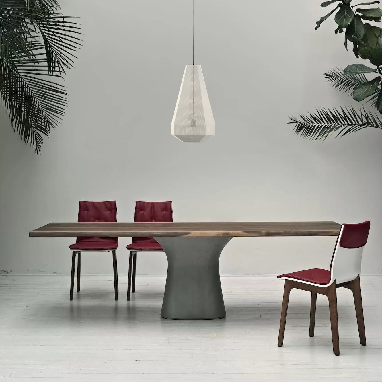 Нераскадной стол Bontempi Podium 52.15 с бетонным основанием. Столешница из шпона с кромкой из массива традиционного орехового дерева, глянцевое стекло, бархатисто-матовое лакированное стекло, устойчивое к царапинам, или супермрамор.