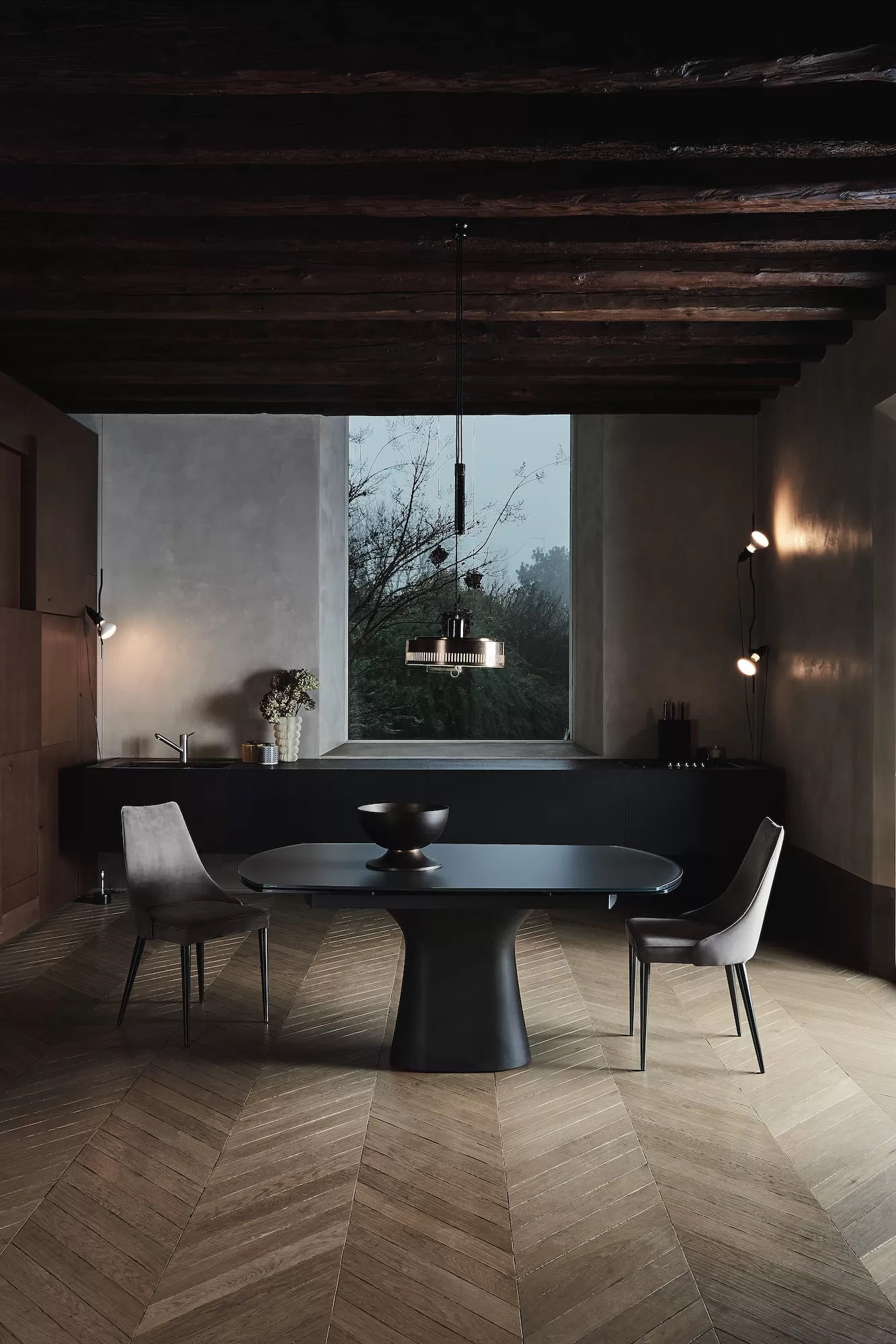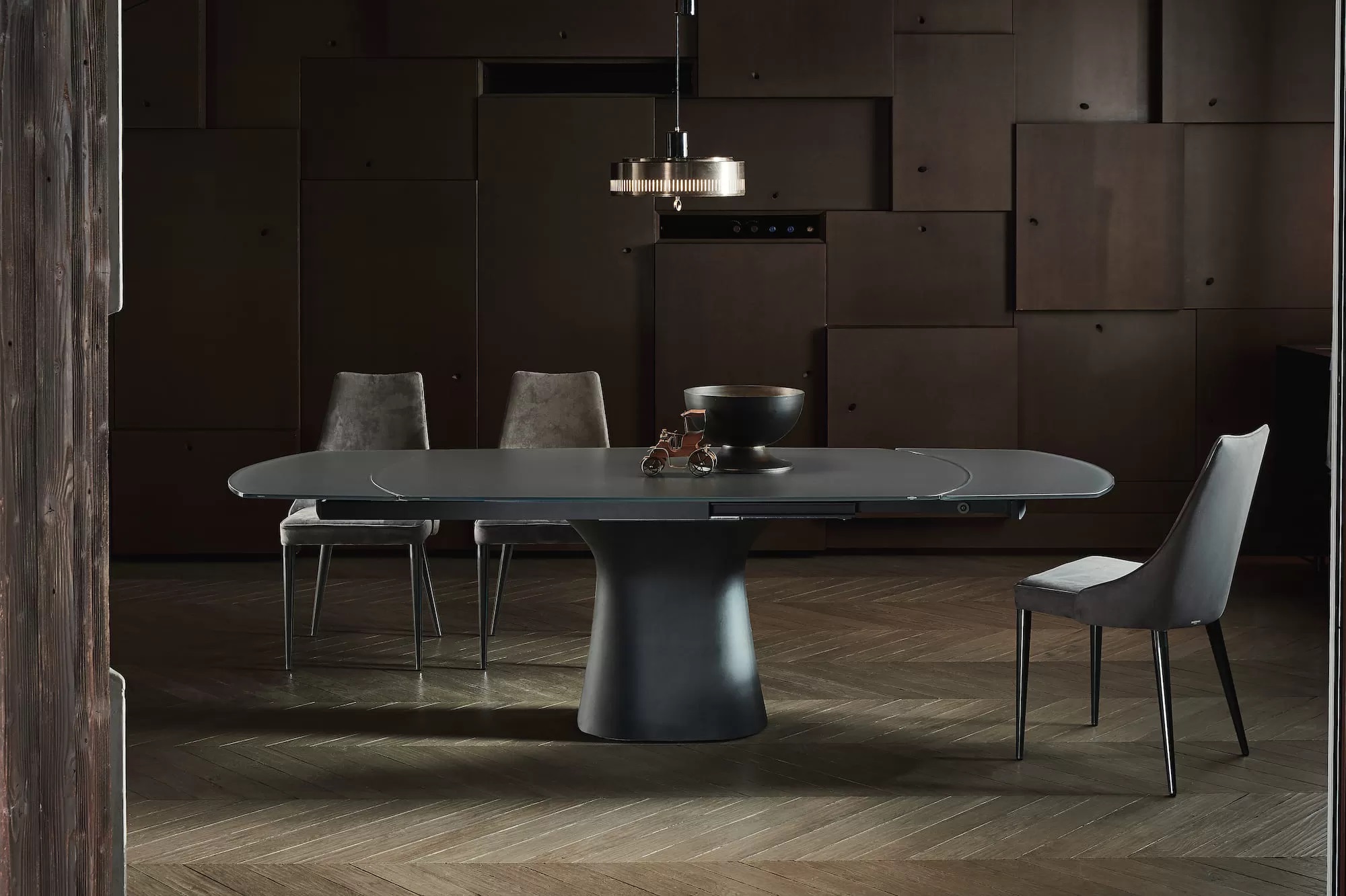 Раскладной стол Bontempi Podium 52.18 с надставками и бетонным основанием. Столешница из глянцевого и бархатного матового лакированного стекла против царапин.