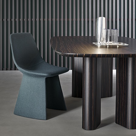 Стул с большим эстетическим эффектом, в котором мягкая линия сиденья сочетается с монолитным объемом основания.
